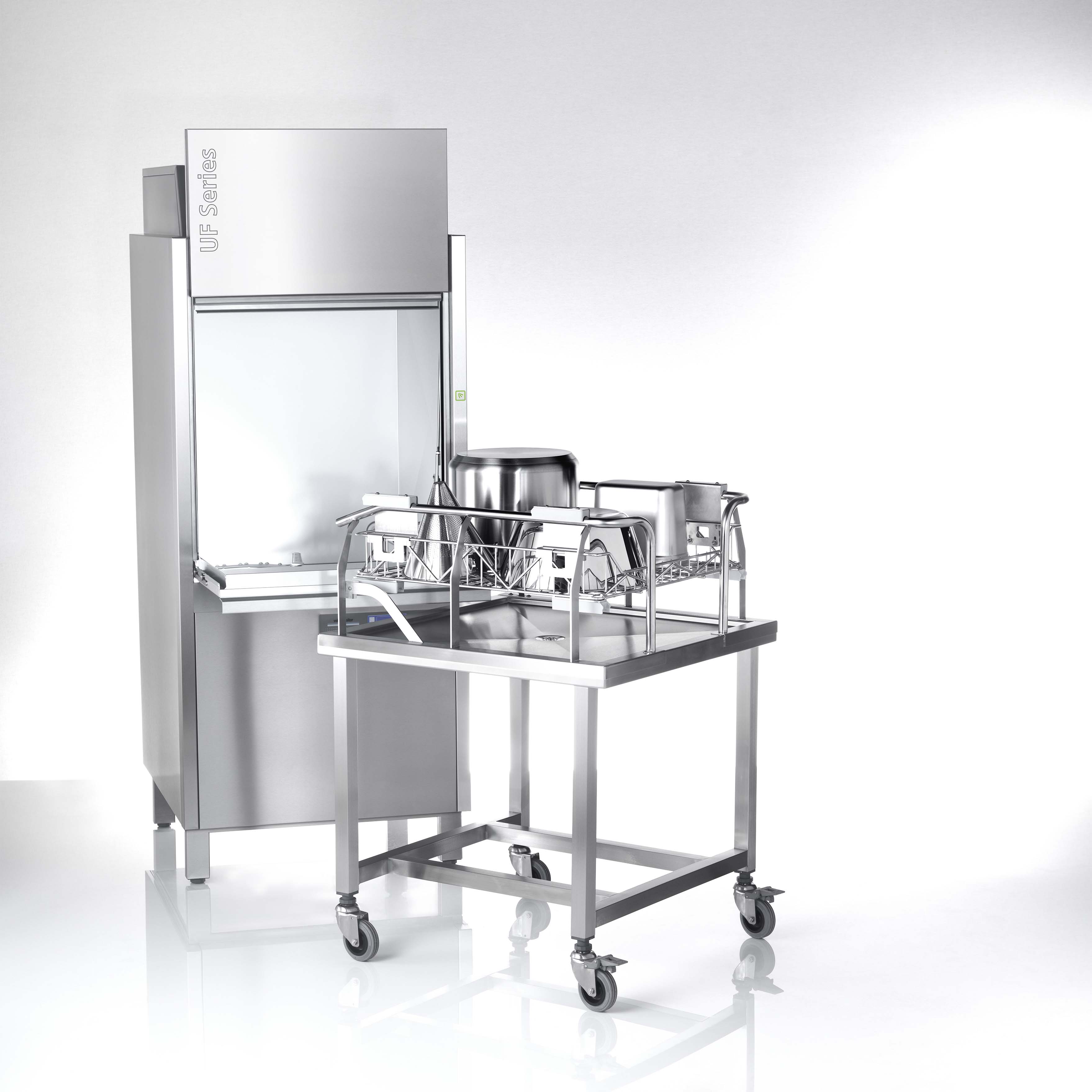 Die UF in der Grösse XL. Die Gerätespülmaschine mit grossem Fassungsvermögen: auch für das Spülen grosser und sperriger Gerätschaften. Ideal für Bäcker, Metzger und Gastronomen.
